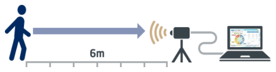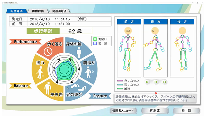 歩行の姿勢、速度、前後左右のブレ、腕や足の運び方などから、歩行年齢を測定します。正しい歩行姿勢とのギャップや年代にそぐった歩き方をしているかどうかを判定することにより、歩行時の姿勢改善の動機付けを高めます。