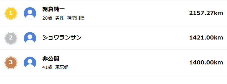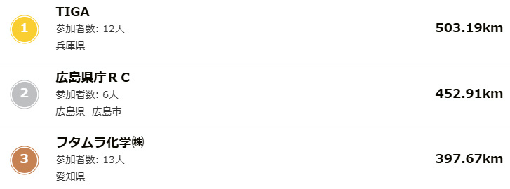 | 順位 | 団体名 | 累積走行距離(km) | 参加者数(人) |